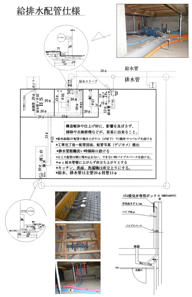 | ●構造躯体や仕上げ材に、影響を及ぼさず、掃除や点検修理などが、容易に出来ること。 ●給排水配管はベタ基礎上配管として、外周部に基礎貫通スリーブを設け外部へ配管を出す。 ●給排水管はすべて床立上りとする。出来ない場合はパイプスペースを設け点検口を付ける。 ●排水管には掃除口を設ける。 |