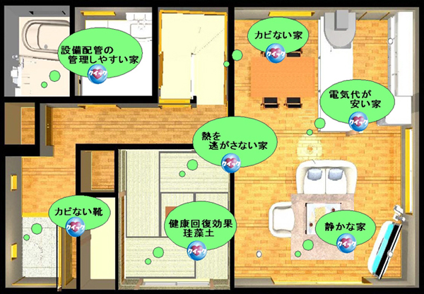 『住宅瑕疵担保責任保険、地盤調査付、バリアフリー仕様、オール電化となっております。 【地産地省(オール国産材)と自然素材で造られています。】 (例えば長期優良住宅助成金+地域産材、住宅エコポイントなど) 建てた後のアフターも素早く対応しております。 |